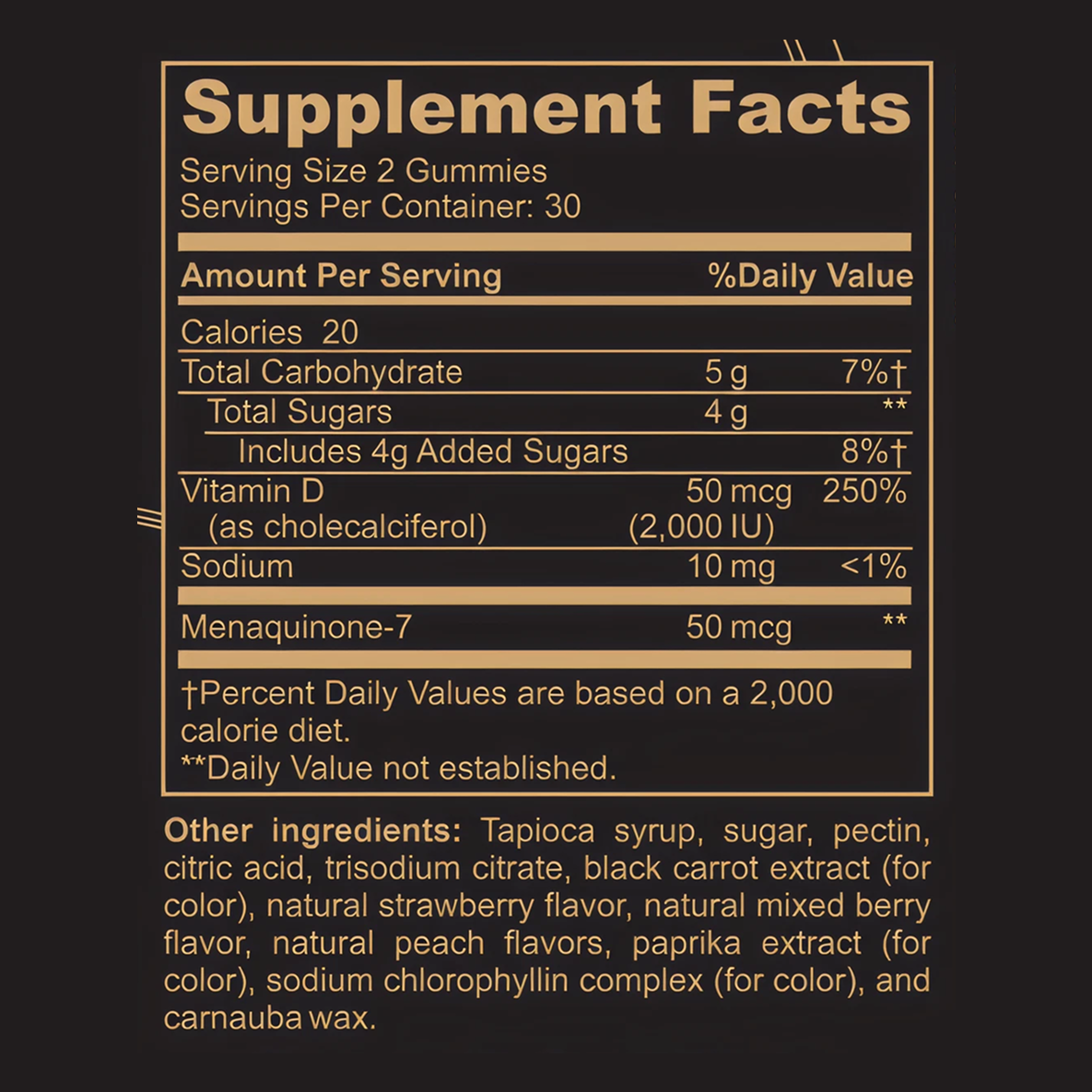 Each gummy provides 2000IU (50mcg) of Vitamin D3 in delightful peach, mango, and strawberry flavors.