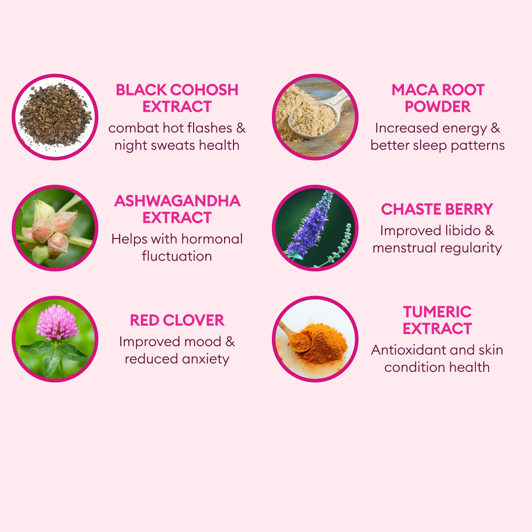 - Herbal & Modern Formula: Features trusted herbs like Black Cohosh, Ashwagandha, and Ginseng to address all areas of menopause.